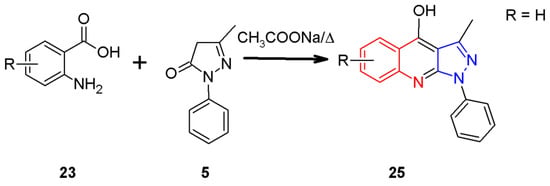 The first attempt to synthesise pyrazoloquinoline by using Niementowski’s synthesis was made by Ghosh in 1937 through the reaction of anthranilic acid 23 and pyrazolone 5 in the presence of anhydrous CH3COONa. The product of the reaction was to be 4-hydroxy-3-methyl-1-phenyl-1H-pyrazolo[3,4-b]quinoline 25 (Scheme 8) [26].