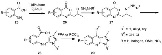 On the other hand, anthranilic acid 23 and its derivatives, in turn, are a valuable substrate for the indirect synthesis of pyrazoloquinolines 29 (Scheme 9). Anthranilic acid 23 is reacted with diketene and acetic anhydride, which yields 2-acetonyl-4H-3,1-benzoxazin-4-one 26, which is easily separated from a reaction mixture by filtration. In the next step, 26 is converted to the pyrazole derivative 28 by reaction with the appropriate hydrazine. There is no need to isolate the intermediate 27. The final step in this reaction sequence is heating 28 in polyphosphoric acid (PPA) or phosphorus oxychloride (POCl3), depending on whether we want to obtain the 4-hydroxy derivative or the compound that contains the chlorine atom in the 4 position (29: R2 = OH or R2 = Cl).