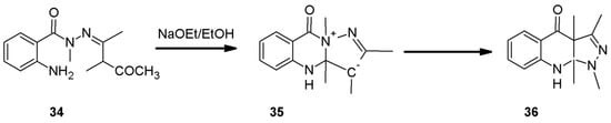 In concluding the discussion of the use of anthranilic acid derivatives, one could also mention the publication of Gal et al., which concerns the transformation of the modified hydrazides of acid 34. Different products were formed, depending on the reaction conditions (e.g., 35). When the reaction was run in the presence of sodium ethoxide, the product was pyrazolo[3,4-b]quinoline 36 (Scheme 12) [32].