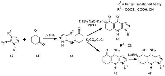 One of the research groups, which was looking for new drugs for the treatment of Alzheimer’s disease, prepared a series of 5,6,7,8-tetrahydropyrazolo[3,4-b]quinoline derivatives, such as 45 and 46, which were then transformed into other systems (e.g., 47) [35]. Aminopyrazoles 42 were prepared from the appropriate benzylhydrazines and ethoxymethylenemalononitrile (42: R2 = CN) or ethyl ethoxymethylenecyanoacetate (42: R2 = COOEt). In the next turn, they were reacted with 1,3-cyclohexanedione 43 in the presence of p-toluenesulfonic acid (p-TSA). As a result, enamino ketones 44 were formed. In the case of the enemino ketone 44, where R2 was a COOEt substituent, the compound was hydrolysed to produce a derivative with the COOH carboxyl group (44: R2 = COOH). Next, cyclisation was performed in the presence of polyphosphoric esters (PPE) afforded 45. The use of potassium carbonate and copper(I) chloride in the case of 44 (R2 = CN) promotes the formation of 46, respectively (Scheme 14).