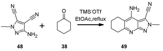Campbell and Firor prepared pyrazolo[3,4-b]quinolines 46 by cadmium-chloride- or copper-acetate-promoted cyclisations of pyrazolo enaminones 44 (R2 = CN, R1 = alkyl) [36]. Instead of toxic cadmium chloride, zinc chloride can also be used [37]. The system with the carbocyclic ring without any functional group can be prepared by starting from cyclohexanone 38 and 4-amino-1-methyl-pyrazole-2,3-dicarbonitrile 48 (Scheme 15) [38].