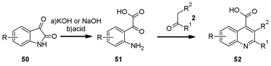 One of the classic named chemical reactions that leads to the quinoline system is the Pfitzinger synthesis [39,40]. It uses isatin or its derivatives 50, which are easier to obtain than o-aminobenzaldehydes. The reaction is carried out in a basic environment, at which point the opening of the heterocyclic ring takes place to form a keto-acid 51, which is then condensed with aldehydes/ketones 2. Additionally, the final product, 52, can be decarboxylated (Scheme 16).