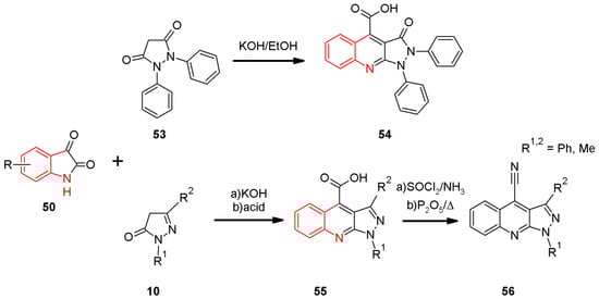 The use of isatin 50 for the synthesis of pyrazolo[3,4-b]quinolines, where this system is built into the backbone, is very limited. One of the reactions is the synthesis that is reported by Fabrini [41]. A reaction between isatine 50 and 1,2-diphenylpyrazolidine-3,5-dione 53 afforded 1H-pyrazolo[3,4-b]quinolin-3-one-4-carboxylic acid 54. In a similar fashion, Seshadri combined isatin 50 and 1,3-disubstituted pyrazolin-5-ones 10 under basic conditions and obtained 4-carboxylic acids 55, and with nitriles 56 after subsequent reactions of 55 with SOCl2 and P2O5 (Scheme 17) [42].