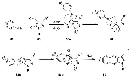 Two possible schemes for this reaction have been found in the literature. One was proposed by Brack (Scheme 19). The reaction starts from the formation of Schiff base 58a from aniline 39 and aldehyde 58. In the next steps, several rearrangements take place with the formation of the final pyrazoloquinoline 59.
