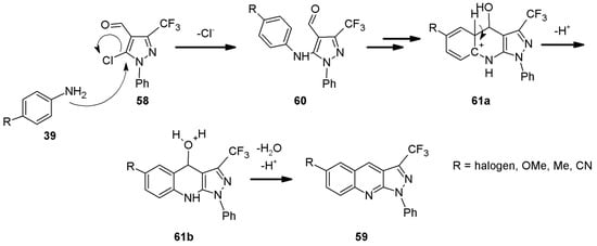 Another mechanism was proposed a few years ago that consists of the nucleophilic substitution of the chlorine atom in pyrazole 58 by an amino group in 39 with subsequent ring formation, and the elimination of the water molecule and hydrogen cation, which leads to the aromatisation of the system (intermediates 60-61b) (Scheme 20) [47]. It seems, however, that the experimental data support the former; therefore, it was possible to isolate the intermediate product, which was Schiff’s base 58a, which was formed from pyrazole aldehyde 58 and substituted aniline 39. The authors of the later paper were not able to isolate amine derivative 60.