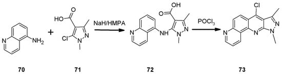 Regardless of the analysis of the structure of compound 73 by using the 1H NMR spectrum, the authors synthesised it by reactions of aminoquinoline 70 and pyrazole acid 71 in the presence of sodium hydride, and they then cyclised the intermediate 72 with POCl3.