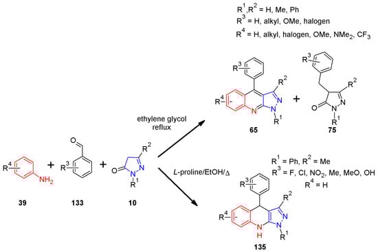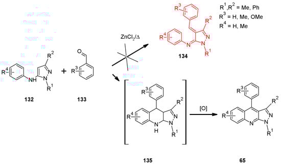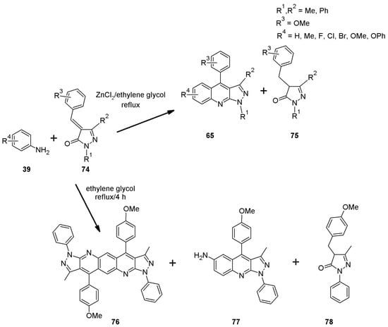 Tomasik et al. report a new method toward 1H-pyrazolo[3,4-b]quinolines that uses anilines 39 and benzylidene derivatives 74 (Scheme 24). This reaction produces derivatives that are substituted with a phenyl group (or a substituted phenyl group) in position 4 of the parent backbone 65. As a side product, compound 75 was isolated. It is an excellent alternative to Friedländer condensation, where 2-aminobenzophenones 1 (R3 = Ph) are used (Scheme 3) [1,53].