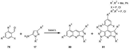 Szlachcic et al. have published a very extensive work on the use of variously substituted o-halogeno benzaldehydes 79 for the synthesis of pyrazoloquinolines 80 [55] (Scheme 25). The authors focused on regioselective reactions, which would allow the preparation of mono- and disubstituted pyrazoloquinoline halogen derivatives, which could be used later for further reactions (e.g., nucleophilic substitution with aliphatic or aromatic amines), and which could be used, for example, as luminophores for the construction of electroluminescent cells.