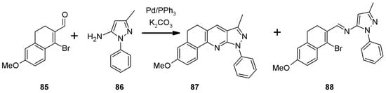 The ratio of the products that were obtained depended on the conditions under which the reaction was carried out. Thus, during heating at 120 °C for 24 h, the Schiff’s base 88 dominated in the reaction mixture, while the reaction that was carried out in the microwave field, without a solvent, for 15 min, favored the formation of pyrazoloquinoline 87. As a catalyst, 2.5 mol% palladium acetate has been proven to be the best.