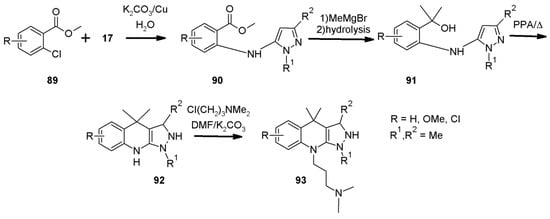 At the end of the description of the use of the o-halogen derivatives of acids, esters and aldehydes, we want to mention the use of a benzyl alcohol derivative that has been cyclised to pyrazoloquinoline. In 1974, Horace de Wald synthesised a series of pyrazoloquinolines 93 as potential antidepressants [60]. As a starting material, he applied the methyl ester of 2-chlorobenzoic acid 89. The Ullmann reaction with 1,3-dimethyl-5-amino pyrazole 17 afforded the formation of 90. This compound was reacted with Grignard reagent CH3MgBr, and it was hydrolysed to yield an alcohol 91, which was cyclised to 92 with PPA at 85–110 °C (Scheme 28).