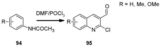 Some modifications are also possible, in which 2-chloro/2-aminoquinolino-3-carbonitrile or 3-acetylquinolin-2(1H)-one can also be used. In 1978, Meth-Cohn et al. described the synthesis of the 5-chloro-4-formylquinoline derivatives 95 by the formylation of Vilsmeier–Haack-substituted acetanilides 94 (Scheme 29) [61,62,63].
