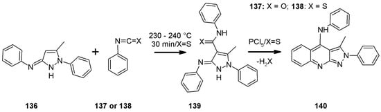 Crenshaw et al. synthesised 10H-pyrido[2,3-h]pyrazolo[3,4-b]quinoline 73 by starting from 5-aminoquinoline 70 and 5-chloro-1,3-dimethylpyrazolo-4-carboxylic acid 71 [52] (Scheme 23). The purpose of this reaction was to confirm the structure of product 73 that was unexpectedly formed by the ring closure of the derivative 28 (R1 = Me, R = 4-NO2), instead of the expected 4-chloro-7-nitro-1,3-dimethyl-1H-pyrazolo[3,4-b]quinoline 29 (R1 = Me, R2 = Cl, R = 7-NO2) (Scheme 9).