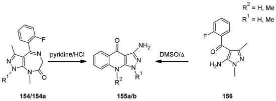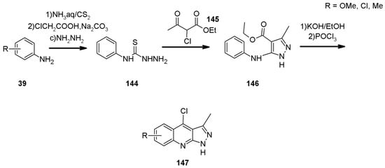 The reaction of 5-aminopyrazoles and the o-halogen derivatives of aromatic carboxylic acids has some importance in the synthesis of pyrazoloquinolines that are substituted at the 4-chlorine/bromine or hydroxyl position. In this two-component reaction (C24), a bond is formed between the nitrogen atom N9 and the carbon C8a, and between the carbon carbon and the carbon C3a (Figure 3; Path 4).