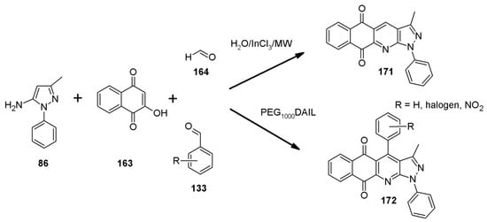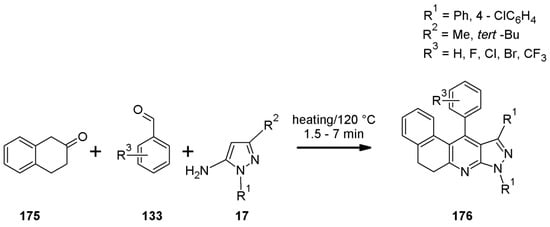 The procedure that was developed by Brack is an extremely effective tool for the synthesis of pyrazoloquinolines. There is also the possibility of using substituted o-halogenobenzoic aldehydes and aminopyrazoles (Figure 7).