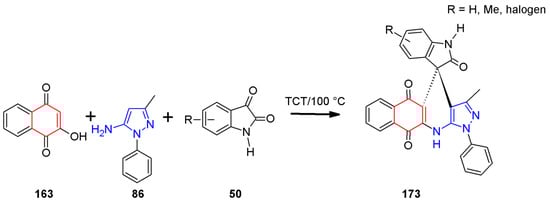 Recently, a few studies have appeared on multicomponent pyrazoloquinolines syntheses where isatins and their derivatives are used. The end product is the spiro-type systems, where isatin brings C-4 carbon to the overall structure. These reactions will be discussed in the final section on the synthesis of this class of compounds.