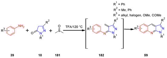 In 1963, Brack published a work on the synthesis of pyrazoloquinolines that was based on the reactions of aromatic amines 39 and 5-chloro-4-formylpyrazoles 58 [43,44]. The latter compounds were obtained by the formylation of the appropriate 5-chloropyrazoles 57 [45]. They can also be obtained in one step in the Vilsmeier–Haack reaction by treating the pyrazolones 10 with a DMF / POCl3 mixture [46]. The original Brack’s reaction was carried out in melt within 110–150 °C (Scheme 18).
