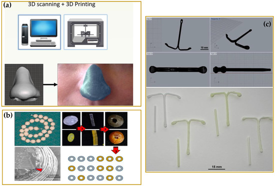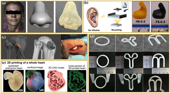 Examples of 3D printed products for biomedical applications. (a) Nose-shaped device. Reprinted with permission from reference [42]; copyright (2016) Elsevier B.V. (b) Anti-biofilm hearing aids. Reprinted with permission from reference [43]; copyright (2021) Elsevier B.V. (c) Guide used during a surgery for tibial plateau fracture. Reprinted from reference [44]; copyright (2021). (d) Vaginal rings. Reprinted with permission from reference [45]; copyright (2018) Elsevier B.V. (e) 3D printed heart. Reprinted from reference [46]; copyright (2016).