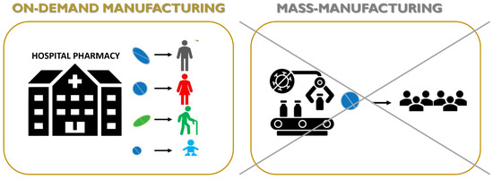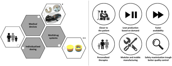 There is a fundamental difference when discussing printing in the context of small-scale compounding in the hospital and pharmacy setting or large-scale manufacturing in the industry setting. In the industrial setting, the main benefits deriving from decentralizing pharmaceutical manufacture are the following [1,30]:
