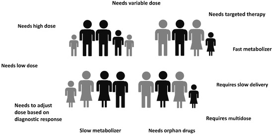 Personalized medicine, also indicated as precision medicine, is a medical approach that separates people into different groups based on individual needs. Personalized medicine takes into account the genetic profile, lifestyle, environment, weight, sex, and age as well as other specific patient needs. A personalized medical approach could be represented by a medical decision or practice, an intervention, and/or a product being tailored to the individual patient based on its predicted response or risk of disease [50,51]. From this point of view, 3D printing possesses the great potential [52,53,54] of linking the patient, with all its real needs, to tailor-made medicines and treatments (Figure 3 and Figure 4).
