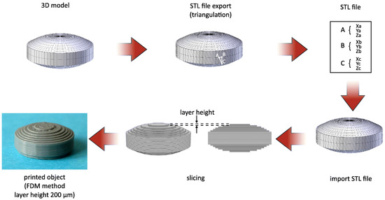 Technically, 3DP can be defined as a layer-by-layer production of 3D objects from digital designs. This technology belongs to the so-called additive manufacturing (AM) processes because the object is produced through the layer-by-layer deposition of starting materials using a print head, nozzle, or another printer technology. Even the term rapid prototyping (RP) is often used to define 3DP since it generally refers to all techniques able to construct objects from digital models created with CAD software. Therefore, additive manufacturing is mainly referred to as the productive step, involving rapid prototyping through the whole procedure [88]. Despite of the diversity of 3DP methods, all exploit a CAD-CAM system. The process starts from the design of a digital model using CAD software; the latter is converted in a STL. file, a machine-readable format which describes the external surface of a 3D model. After this step, the STL. file is imported to the printer software (CAM software) that, through a slicing process, generates the layers which will be printed in an additive way by the printer. The height of the printed layer essentially influences the quality of the printed object as well as printing time. In addition, a specific post-processing step could be required to get the final product, based on the specific 3DP method selected. Figure 6 shows in a detailed way the main steps involved during the 3DP of a printlet (3D printed tablet) using fused deposition modeling as the productive technology.