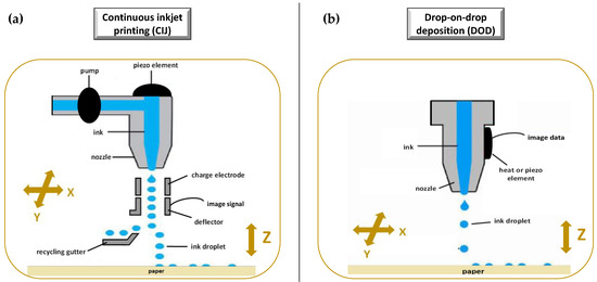 Ink-jet based printing technology (a) Continuous (CIJ), (b) drop-on-demand (DoD).