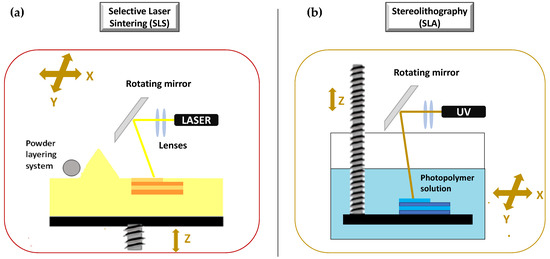The production of a 3D object by SLA is based on the controlled solidification of subsequent layers of resin by photo-polymerization via ultraviolet laser beam or light from a projector (digital light projector, DLP) [113]. During the SLA process, the printed object is bound to the built platform that is immersed in the photopolymer solution (Figure 10b). A digital mirroring device starts a chemical reaction in the photopolymer, which causes the cross-linking of the exposed area. The layer is traced on the surface of the resin.