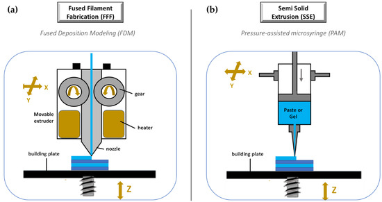 The third group of 3D-printing technologies is represented by nozzle-based deposition systems allowing direct writing through extrusion. Such systems deposit ink direct through a nozzle to create a 3D pattern layer-by-layer with controlled composition and architecture [119]. They can be basically divided into processes based on material melting, such as fused filament fabrication (FFF), also referred to as fused deposition modelling (FDM), and processes without material melting, such as semi solid extrusion (SSE), also known as pressure-assisted microsyringe (PAM). Nozzle based 3DP technologies have been highly investigated due to their great versatility, reproducibility, and high scalability potential. A lot of papers in the literature have focused on the application of such techniques to develop pharmaceutical as well as biomedical products.