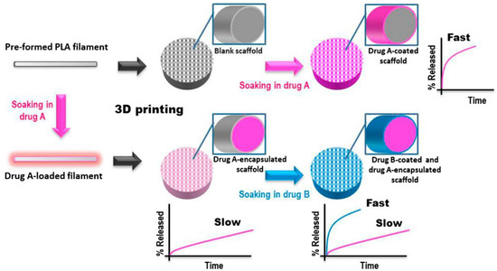 A challenge of regenerative medicine is to realize controlled drug-releasing tissue engineered platforms able to exert both an initial burst release as well as a sustained or long-term release of the loaded drug/s. In this case, a sequential or multiphasic release patterns is required, which may aid to enhance the speed, quantity, and quality of tissue regeneration. With this in mind, recently, Farto-Vaamonde et al. explored the soaking/swelling of PLA to personalize the steroidal anti-inflammatory drugs (SAIDs) release profile from scaffolds intended for regenerative purposes [134]. Two different drug loading strategies were exploited (see Figure 12). In the first case, to obtain feedstock for 3D FDM printer, the soaking of PLA filaments into a volatile solvent mixture containing the drug followed by drying was applied. The second strategy consisted in first printing the 3D PLA scaffolds followed by soaking in a suitable SAID solution. Results showed that during 3DP of drug loaded PLA filament, the melting of PLA contributes to the efficient encapsulation of the SAID inside the printed strand, leading to a sustained drug release profile from the scaffold for several months. Differently, 3D PLA scaffolds, loaded after printing with either prednisolone or dexamethasone, show that the coating of the scaffold strands with a layer of crystalline drug nanoparticles, consequently leading to a burst rapid release. This evidence led us to design a dually loaded scaffold exhibiting distinct drug release patterns. Dexamethasone loaded within the strand core showed a sustained release, whereas prednisolone loaded on the strand surface gave an immediate release thanks to the combination of two loading methods.