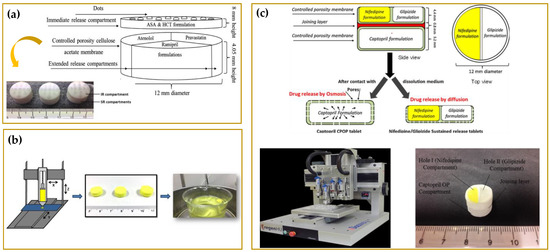 Examples of 3D printed oral dosage forms produced by FFF technique. (a) Multilayer device and Duo-caplet. Adapted with permission from reference [155]; copyright (2015) American Chemical Society; (b) HME polycaprolactone-based filaments intended for 3D-printing of tablets with a lattice (“honeycomb”) structure. Reprinted with permission from reference [136]; copyright (2020) Elsevier B.V.; (c) Cardiovascular ‘Polypill’ loaded with four different drugs. Reprinted with permission from reference [159]; copyright (2018) Elsevier B.V.