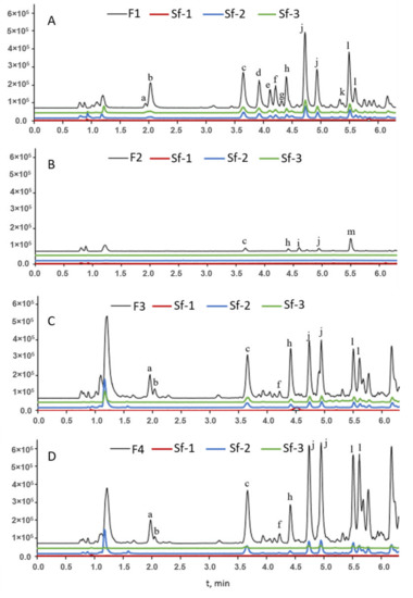 The preparative HPLC separation of the F3 main fraction had results similar to the F1 separation—equal distribution between subfractions Sf-2 and Sf-4. Separation of the F4 main fraction resulted in the subfraction Sf-2 with a similar qualitative composition as the main fraction, while Sf-3 had only a few chemical constituents related to the following structures: C6H6O2 (109.03 Da), C7H8O2 (123.05 Da) and C8H10O2 (137.07 Da).