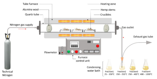 Hemp stems (196.5 g) were cut to smaller pieces of 15 cm length and placed in rectangular alumina boats inside a Nabertherm RSRC 120-1000/13 tube furnace. No drying step was added prior to the thermochemical conversion in order to preserve the sensitive volatiles in the stems. The thermochemical process was performed under an inert N2 atmosphere from 20 to 400 °C at 100 °C/h, and from 400 °C to 1000 °C at 600 °C/h. A higher heating rate was chosen for the second part of the conversion to speed up the process, taking into account that most of the volatiles are released at temperatures below 400 °C [6]. While the solid biochar residue remains in the crucibles, the nitrogen flow carries the gaseous compounds out of the tube furnace through a pipe ending in a 500 mL distilled water trap (Figure 5). After the thermochemical conversion cycle, the furnace was cooled, and the solid residues were removed. The solid biochar residue was weighed to calculate the yield based on the following formula (1).