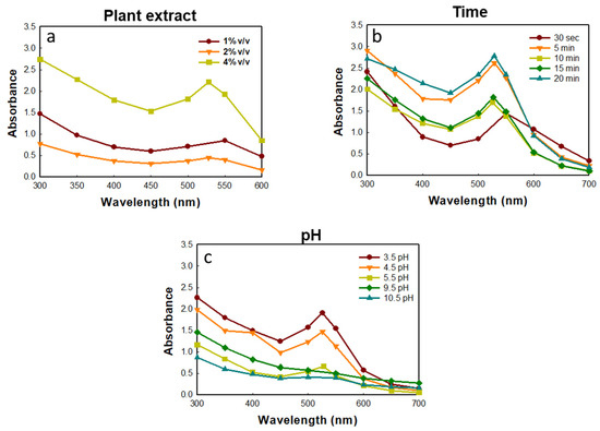 GP-AuNP stability was examined by UV–VIS performed at different time intervals and pH at ambient temperature. To check the time stability, the absorbance of the collected nanoparticle was determined from 30 s to 20 min. Similarly, the pH stability was selected in the range of 3–10 pH with a UV–VIS spectrophotometer [62].