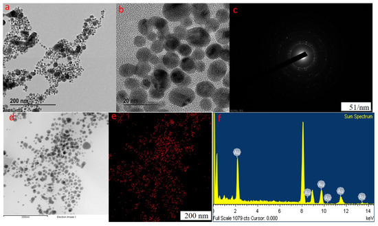 The FE-TEM analysis results confirm the size and shape of the synthesized nanoparticles. In previous reports, hexagonal-, triangular-, and spherical-shaped gold nanoparticles were observed [41]. Our manufactured nanoparticles were spherical and measured in 20–200 nm (Figure 2a,b and Figure 3d). Furthermore, our synthesized nanoparticles were thoroughly monodispersed in nature, which is essential to eliminate polydispersity problems linked to biogenic synthesis. The selected area diffraction pattern (SAED) was utilized to examine the crystallinity of the GP-AuNPs (Figure 3c). The diffraction pattern in a ring form designates the crystalline nature of the formed nanoparticles. The maximum distribution of gold nanoparticles was inspected by elemental mapping, and results reflected in their respective electron micrograph image, which confirmed the predominant distribution of GP-AuNPs. In EDX analysis, the optical absorption band peak of GP-AuNPs exhibited at approximately 2.2 keV, resulting in the formation of pure nanoparticles (Figure 3e,f). Other metal ions were observed in the EDX spectrum belonging to the TEM grid used for the analysis.