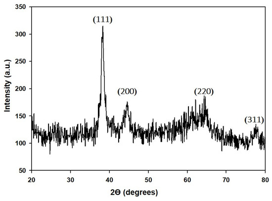 The crystalline structure and purity of GP-AuNPs were observed by X-ray diffraction spectroscopy (XRD) patterns presented in (Figure 5). The diffraction peaks at 38.1°, 44.41°, 64.60°, and 78.31° were attributed to the (111), (200), (220), and (311) lattice planes, respectively. XRD result indicates that GP-AuNPs have a face-centered cubic (FCC) structure. This result is nearly close to gold nanoparticles’ XRD data published previously [44].
