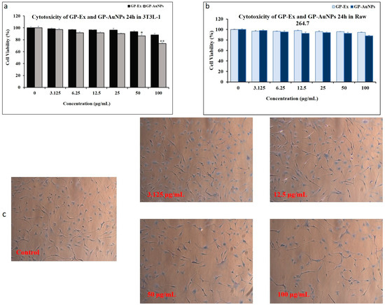 The cell viability of GP-AuNPs was examined, following the incubation of 3T3-L1 and Raw 264.7 cells with various concentrations of GP extracts and GP-AuNPs for 24 h shown in Figure 6a–c. Cell survival rate was measured as a percentage of the viability of control or untreated cells. As displayed in Figure 6, after incubation with GP extracts and GP-AuNPs with concentrations ranging from 3.125 to 100 μg/mL, no significant toxicity or cell death was shown until 100 μg/mL in Raw 264.7 cells compared with the untreated cells. However, at 100 μg/mL in 3T3-L1 cells, GP-AuNPs started to show significant cytotoxicity. Therefore, we selected 3.125, 12.5, and 50 μg/mL for the subsequent experiments.