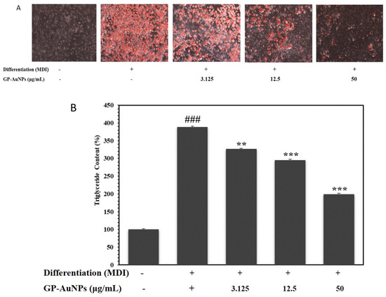 Inhibitory effect of the lipid accumulation for GP-AuNPs on MDI-induced 3T3-L1 adipocytes. (A) Fat droplets were measured by oil red O staining and observed using a microscope (at ×40). (B) The absorbance of lipid accumulation, which was oil red O dye, was dissolved in isopropyl alcohol (520 nm). The data are mean values of three experiments ± SEM; ### <0.001 compared with control, ** p < 0.01, *** p < 0.001 compared with the MDI.