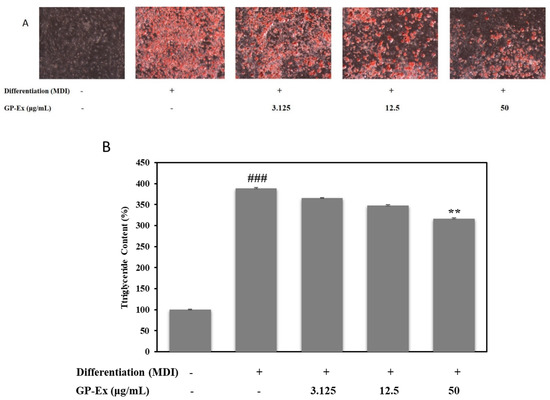 Inhibitory Effect of the lipid accumulation for GP extract on MDI-induced 3T3-L1 adipocytes. (A) Fat droplets were measured by oil red O staining and observed using a microscope (at ×40). (B) The absorbance of lipid accumulation, which was oil red O dye, was dissolved in isopropyl alcohol (520 nm). The data are mean values of three experiments ± SEM; ### <0.01 compared with control, ** p < 0.01 compared with the MDI.