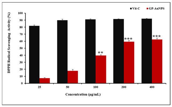 Dose-dependent in vitro DPPH radical scavenging and antioxidant activity of biosynthesized GP-AuNPs. Approximately 60% of DPPH inhibition was recorded at the 200 and 400 µg/mL. The data shown represent the mean values of three experiments ± SD. ** p < 0.01, *** p < 0.001 as compared with the Vit-C.2.5. Effect of GP-AuNPs on the LPS-induced NO production.