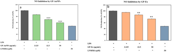 Nitric oxide (NO) is the most dominant proinflammatory mediator that induces inflammation due to overproduction in abnormal situations, such as arthritis, inflammatory bowel diseases, and other inflammatory diseases of the respiratory system [47]. Consequently, subduing the overproduction of NO has become a potential prey in drug discovery for treating inflammatory disorders. We inspected the anti-inflammatory effect of GP-AuNPs on reducing NO production in LPS-induced RAW 264.7 cells. A common potent inhibitor of endothelial nitric oxide synthase, namely, L-NMMA, was used as a positive control in our study [48]. As shown in Figure 10, NO production is significantly higher in LPS-treated cells, whereas in both GP-Ex- and GP-AuNP-treated LPS-induced cells, NO production has decreased in a dose-dependent manner.