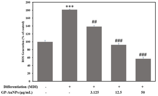 Inhibition of reactive oxygen species (ROS) generation by GP-AuNPs in MDI-induced 3T3-L1 adipocytes was determined by DCFDA method. GP-AuNP treatment reduced intracellular ROS production dose dependently. Data are expressed as a percentage of control. *** p < 0.001 MDI vs. control, while ## p < 0.01 and ### p < 0.001 GP-AuNPs vs. MDI.