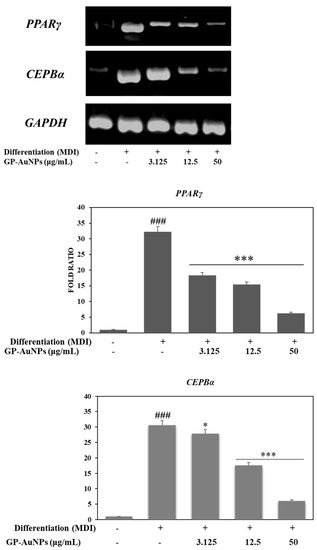The mechanisms of the antiobesity activities of GP-AuNPs on 3T3-L1 adipocyte differentiation and lipid accumulation were analyzed by RT-PCR. Both PPARγ and C/EBPα are critical markers for cellular responses related to adipocyte differentiation and lipid accumulation [53]. PPARγ is a master regulator, and the activity of PPARγ is thought to be mediated by the regulator C/EBPβ [54]. To investigate the inhibitory effect of GP-AuNP adipocyte differentiation, the expressions of PPARγ and C/EBPα were examined via RT-PCR. GP-AuNP treatment notably inhibited the PPARγ and C/EBPα expression in a concentration-dependent manner, as displayed in Figure 12. Our results suggest that GP-AuNPs inhibited adipogenesis by significantly downregulating the transcriptional factors.