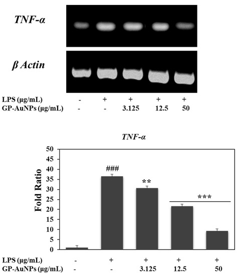Effect of GP-AuNPs on the transcriptional activation of the inflammatory gene TNF-α in RAW 264.7 cells. RAW 264.7 cells were pretreated with the indicated concentrations GP-AuNPs for 1 h, and then stimulated with LPS (1 μg/mL) for 24 h. Subsequently, total RNAs were extracted, and the mRNA expression levels were determined by RT-PCR analysis and compared with those of β-actin. The data shown are representative of the mean values of three independent experiments ± SD. ** p < 0.01, *** p < 0.001 as compared with the group treated with LPS, and ### p < 0.001 as compared with the control.