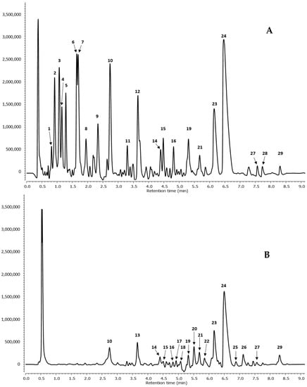 UPLC–MS chromatogram profile of Alder acorns (A) water and (B) ethanol extracts at 280 nm. Peak number identities are displayed in Table 1.