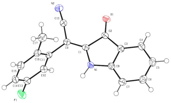 ORTEP drawing of X-Ray structures of (E)-2-(5-fluoro-2-methylphenyl)-2-(3-oxoindolin-2-ylidene)acetonitrile (2al, CCDC #2157035). The thermal ellipsoids are shown at 50% probability. Green:fluorine; blue:nitrogen; red:oxygen, gray:carbon.