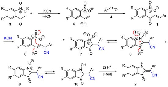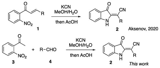 The derivatives of 2-Alkylideneindolin-3-one play important role in modern medicinal chemistry. The bis-indole indirubin known as “Tyrian purple” dye has been used for many years as an active component of a traditional Chinese herbal medicine [,,]. Lately, numerous synthetic analogs of this compound were reported to show potent and highly selective pharmacological inhibition of glycogen synthase kinases and cycline-dependent kinases [,,]. Related compounds possessing a single 3-oxoindoline subunit (or two remotely positioned subunits) also were isolated from natural sources and are also known to exhibit a wide spectrum of important biological properties [,,,,,,]. Normally, the preparation of these structures relies heavily on the chemistry of isatins, which greatly limits the diversity of accessible substitution patterns. Alternative methods have also been developed based on the aldol condensation of 3H-indol-3-ones with carbonyl compounds [,,,], the transition metal-catalyzed carbonylative cross-coupling of ortho-iodoanilines to alkynes [,,,], or the cascade cyclizations of anilines with -ketoesters [,]. We recently reported an original, facile, and highly efficient method for the preparation of 2-(3-oxoindolin-2-ylidene) acetonitriles 2 from ortho-nitrochalcones 1, operating as a triggered Michael addition of the cyanide anion to the chalcone followed by a cascade cyclization mechanistically related to the Baeyer–Drewson reaction (Scheme 1) [].