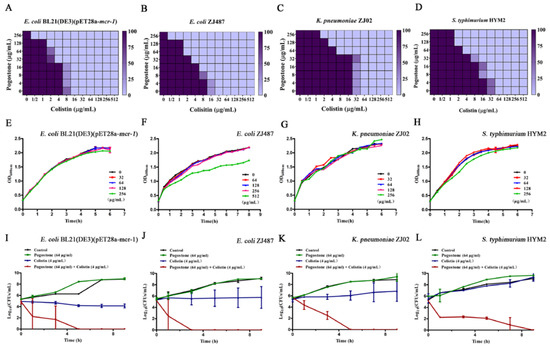 Pogostone rescues the activity of colistin. (A–D) Checkerboard MIC analysis showing the combined effect of pogostone and colistin against MCR-1-positive strains (E. coli BL21 (DE3) (pET28a-mcr-1), E. coli ZJ487, K. pneumoniae ZJ02 and S. typhimurium HYM2). (E–H) The growth curves E. coli BL21 (DE3) (pET28a-mcr-1), E. coli ZJ487, K. pneumoniae ZJ02 and S. typhimurium HYM2 under different concentrations of pogostone (0, 32–512 μg/mL). (I–L) Time-killing assays of different combinations of pogostone and colistin compared with single compound or control treatments (only medium) against E. coli BL21 (DE3) (pET28a-mcr-1), E. coli ZJ487, K. pneumoniae ZJ02, and S. typhimurium HYM2. Values represent the averages of three independent experiments.
