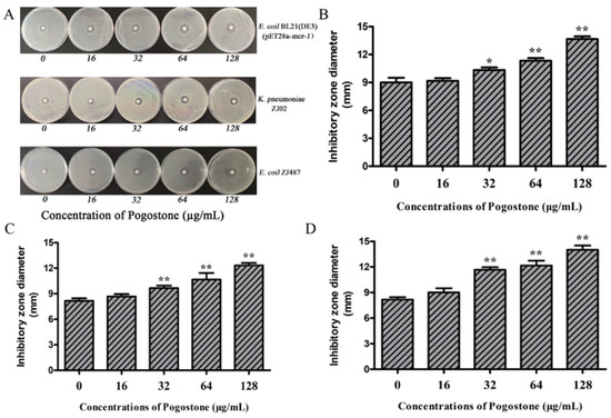Zone of inhibition test of colistin combined with pogostone (A–D). Zones of inhibition surrounding the disks of colistin supplemented with 0, 16–128 μg/mL pogostone. Values represent the averages of three independent experiments. ** p < 0.01; * p < 0.05.
