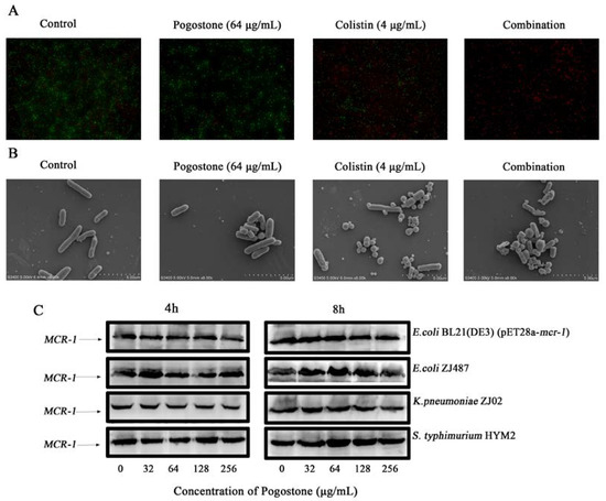 (A) Staining of live (green) and dead (red) bacteria. (B) The morphology of E. coli BL21 (DE3) (pET28a-mcr-1) observed by SEM. (C) MCR-1 production in E. coli BL21 (DE3) (pET28a-mcr-1), E. coli ZJ487, K. pneumoniae ZJ02 and S. typhimurium HYM2 treated with the indicated concentrations of pogostone (0, 32, 64, 128, or 256 μg/mL) by western blot assays.