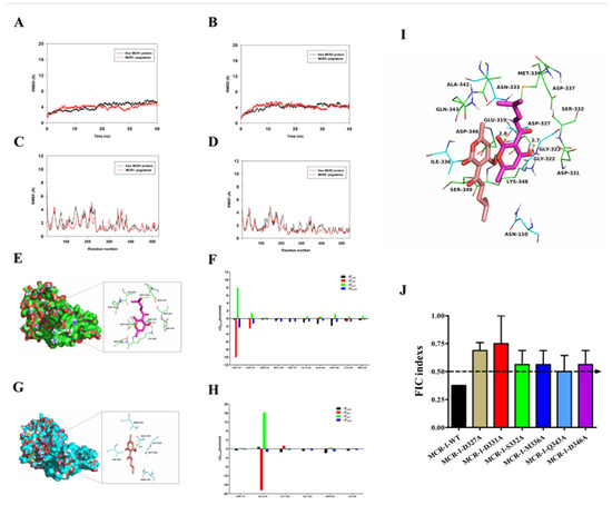 (A,B) The RMSDs of all the atoms of MCR-1/3-pogostone complexes with respect to the initial structure. (C,D) The RMSF of residues in the MCR-1/3-pogostone complex and free protein of MCR-1. (E,G) The 3D structures of MCR-1/3-pogostone complex by molecular modeling analysis. (F,H) The binding energy on a per-residue basis in the binding sites of MCR-1/3-pogostone complex. (I) Binding pattern diagram of MCR-1/3-pogostone complex (superposition). (J) The FIC indexes of pogostone with colistin of MCR-1-positive E. coli BL21 (DE3) (pET28a-mcr-1) and its MCR-1 mutants.