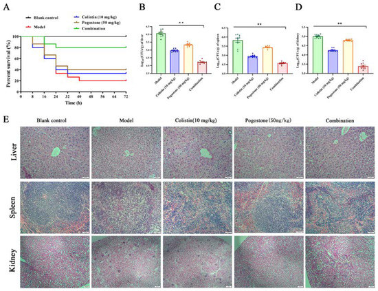 Effects of the combination therapy with colistin and pogostone in vivo. The mice were infected by intraperitoneal injection with E. coli ZJ478. The survival rate (A) and the bacterial loading of the liver, spleen, and kidney were calculated (B–D). The histopathological changes of liver, spleen, and kidney of the mice in different groups are shown in (E). ** p < 0.01.